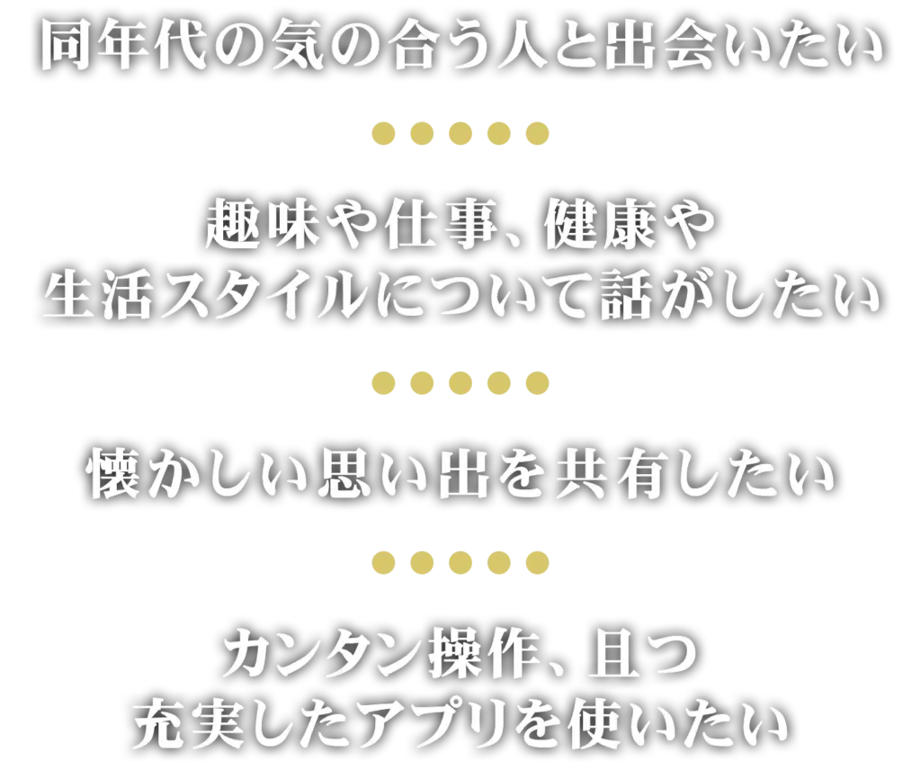 同世代の方々が出会い、趣味や仕事、健康やライフスタイルについて情報を共有できます。